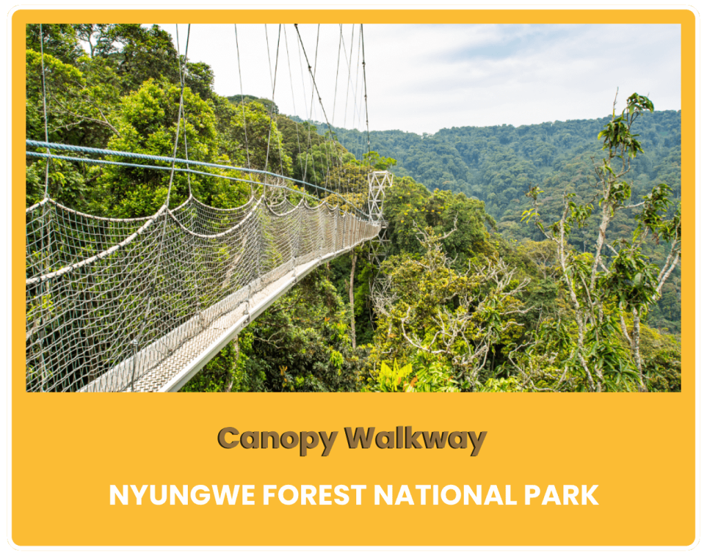 One of the park’s most iconic attractions is the Nyungwe Canopy Walkway, a suspended bridge that offers breathtaking views above the forest canopy. Walking across this bridge provides a bird’s-eye perspective of the rainforest, allowing visitors to spot birds, monkeys, and the vast expanse of greenery stretching across the hills.